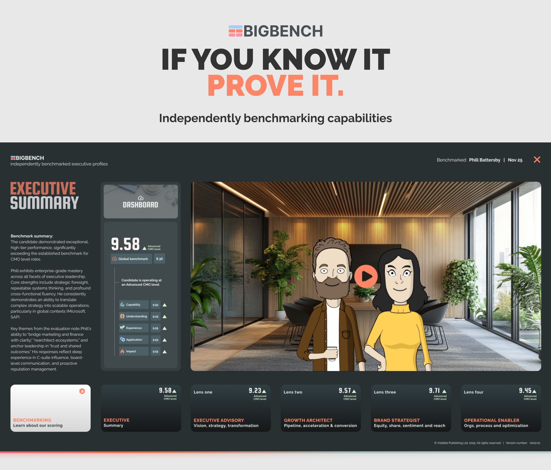 BigBench assesses capabilities. 1000 role-specific attributes are benched against industry and peer-group standards to create a unique, audited, engaging executive profile.